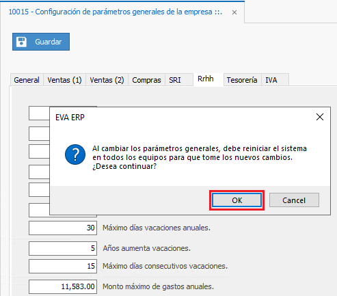 4) Se muestra el mensaje, indicando que para Cambiar los parámetros generales, debe reiniciar el sistema en todos los equipos para que tome los nuevos cambios. ¿Desea continuar?. Dar clic en el botón Ok.