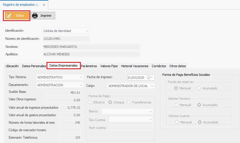 3) Seleccione al empleado, dar doble clic sobre el empleado o dar clic en el botón Editar. Se apertura la pestaña con el nombre Registro de empleado, dar clic en el botón Editar.