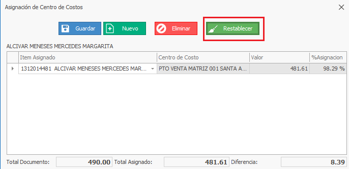 6) Se apertura una ventana con el nombre Asignación de Centro de Costos, dar clic en el botón Restablecer,