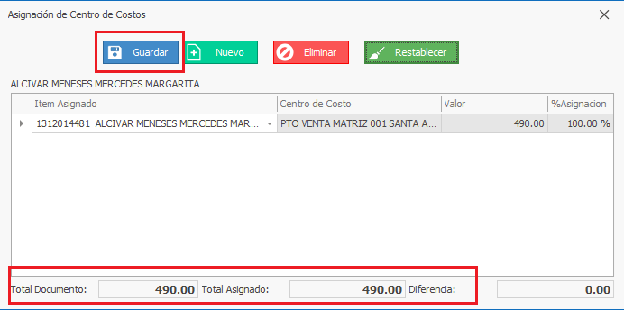 7) Una vez se distribuya el Total del documento con el Total Asignado, dar clic en el botón Guardar.