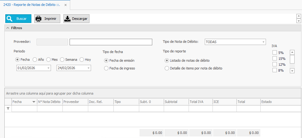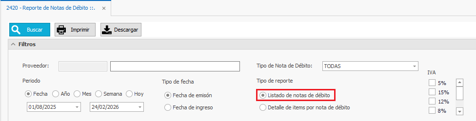 - Tipo de Nota de Débito: Podrá seleccionar el tipo de Nota de Débito que desea mostrar.