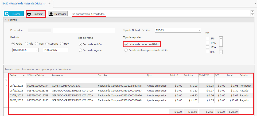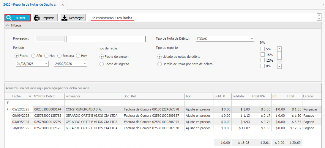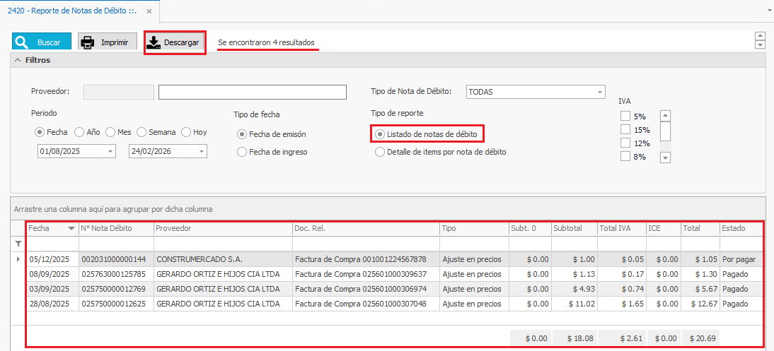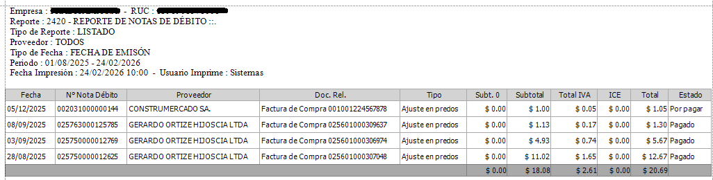 1) Diríjase al menú lateral izquierdo, al Módulo: Compras - 4 Reportes Transaccionales - Notas de Débito - 2420.