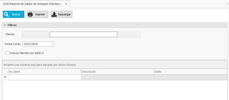 2) Se apertura la pestaña con el nombre 1630 - Reporte de Saldos de Anticipos Clientes.