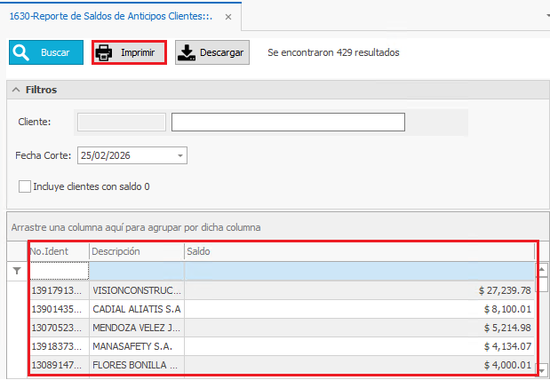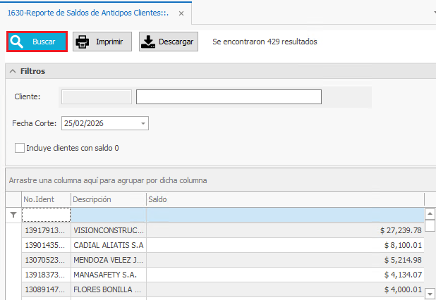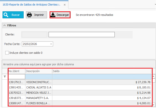 - Saldo: Muestra el saldo de anticipo que tiene el Cliente.