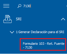 1) Diríjase al menú lateral izquierdo, al Módulo: SRI - 1 Generar Declaración para el SRI - Formulario 103 - Ret. Fuente - 7130.