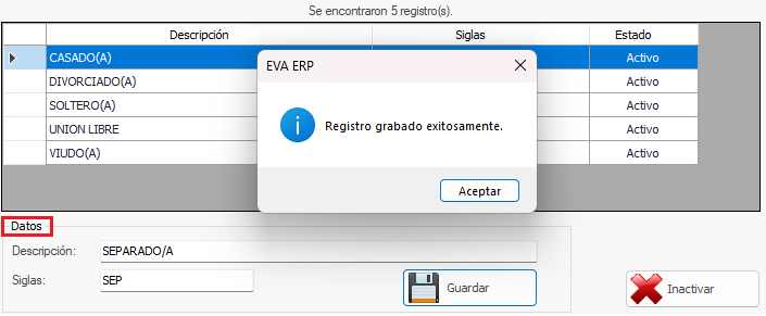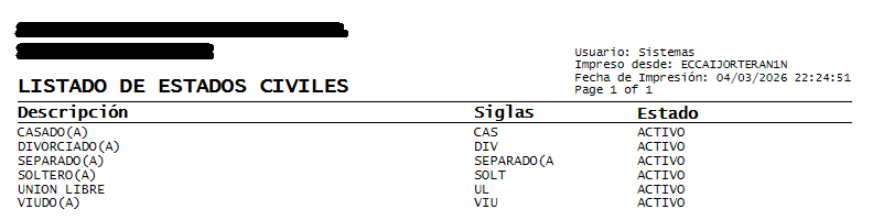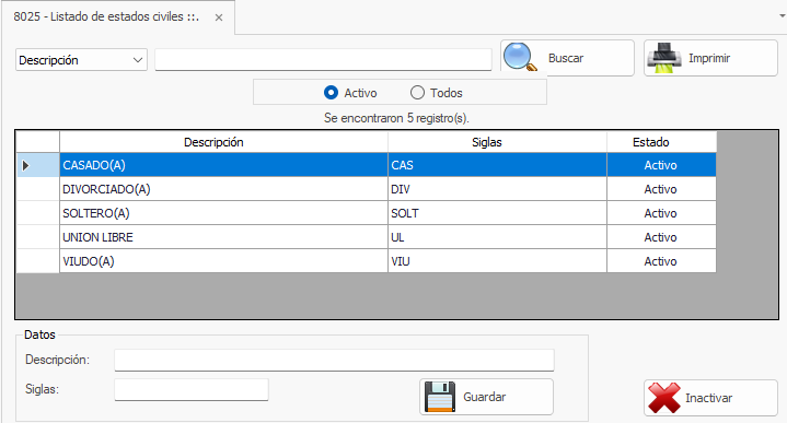 4) En la parte inferior, muestra los Estados Civiles configurados en el sistema con el siguiente detalle: Descripción, Siglas y Estado.