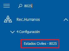1) Diríjase al menú lateral izquierdo, al Módulo: Rec.Humanos - 4 Configuración - Estados Civiles - 8025.