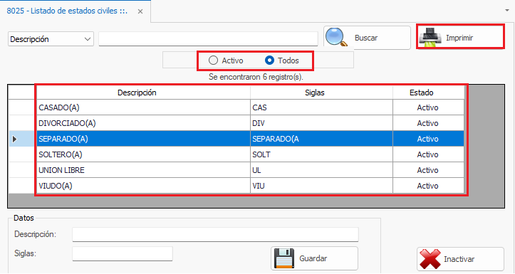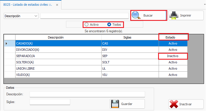 3) La función del filtro, le permite buscar la información ya sea por Descripción o Siglas del Estado Civil. Adicional puede realizar la búsqueda por Estado: Activos o Todos.