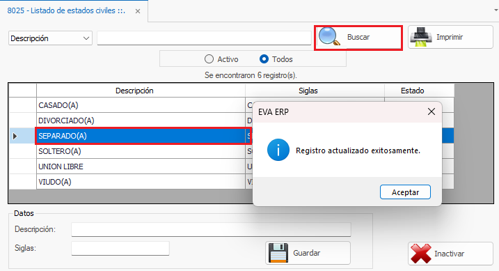 4) Si desea activar el Estado Civil, debe seleccionar el Estado Civil Inactivo, dar clic en el botón Activar.