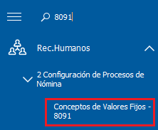 1) Diríjase al menú lateral izquierdo, al Módulo: Rec.Humanos - 2 Configuración de Procesos de Nómina - Conceptos de Valores Fijos - 8091.