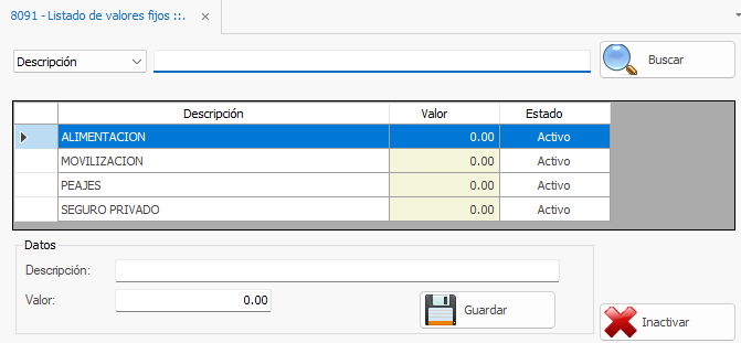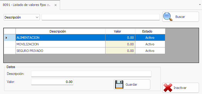 2) Se apertura la pestaña con el nombre 8091 - Listado de Valores Fijos.