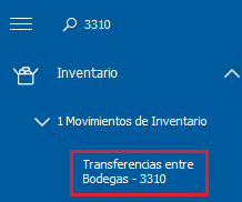 ó desde el menú lateral izquierdo, al Módulo: Inventario - 1 Movimientos de Inventario - Transferencia entre Bodegas - 3310, dar clic en el botón Nueva transferencia.