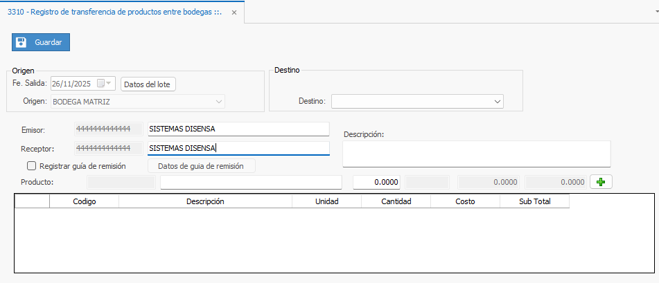 2) Se apertura la pestaña con el nombre 3310 - Registro de Transferencia de productos entre bodegas.